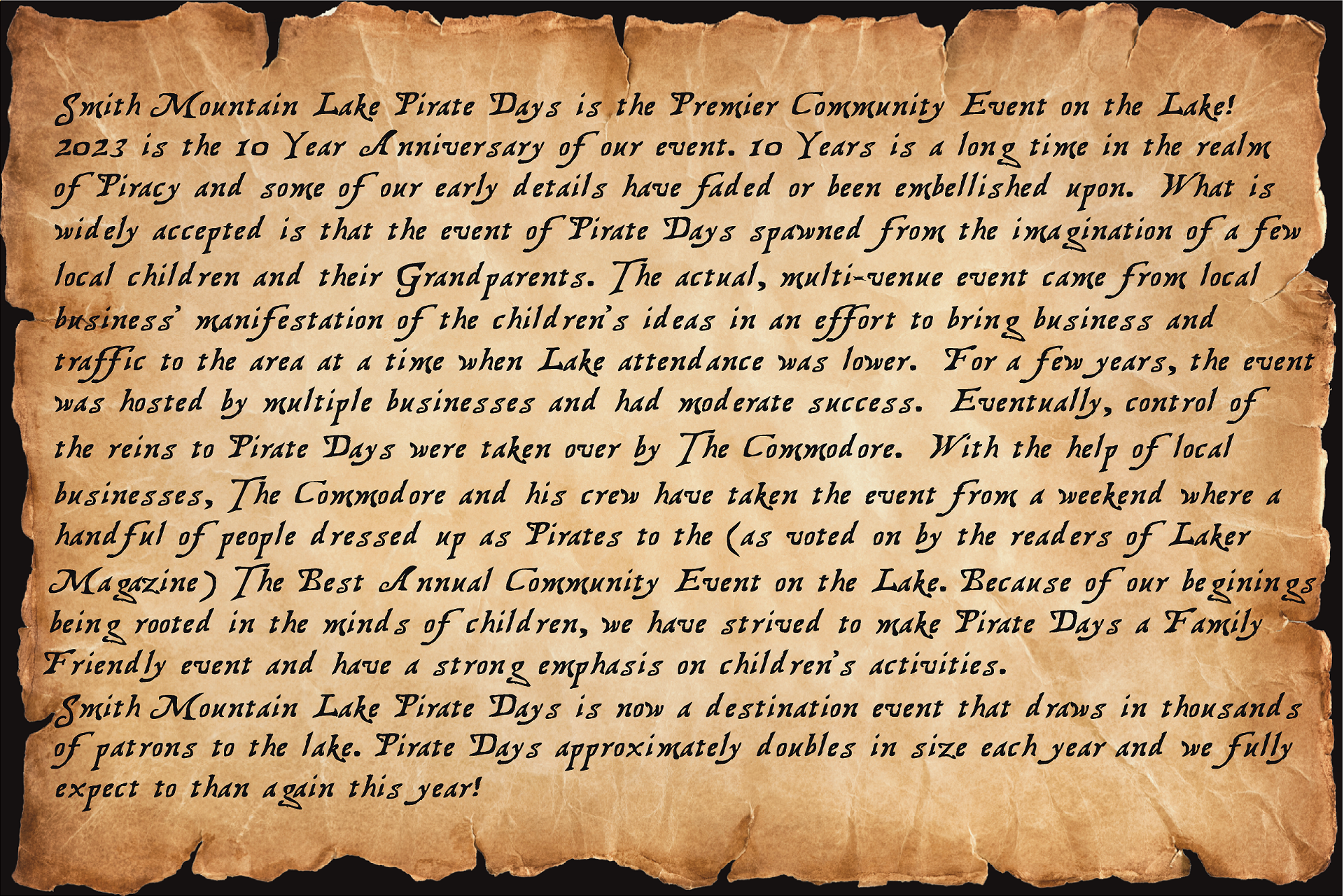 Smith Mountain Lake Pirates Days are always the third week of July and is a lake wide celebration